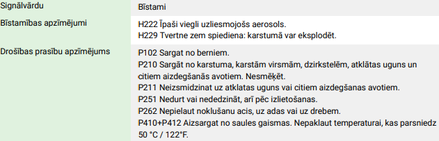 EUH066, Atkārtota iedarbība var radīt sausu ādu vai izraisīt tās sprēgāšanu. H224, Īpaši viegli uzliesmojošs šķidrums un tvaiki. H225, Viegli uzliesmojošs šķidrums un tvaiki. H304, Var izraisīt nāvi, ja norij vai iekļūst elpceļos. H315, Kairina ādu. H319, Izraisa nopietnu acu kairinājumu. H336, Var izraisīt miegainību vai reiboņus. H411, Toksisks ūdens organismiem ar ilgstošām sekām.