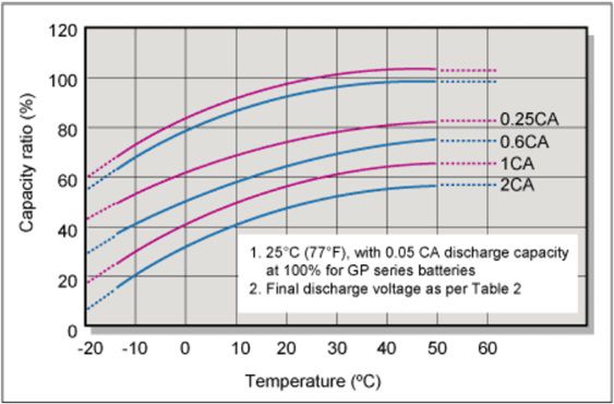 Pazeminoties apkārtējās vides temperatūrai, reakciju ātrums palēninās. Lai akumulators aukstā ziemas rītā uzticami grieztu starteri, tam ir jābūt pilnībā uzlādētam. Ziemā dzinēja iedarbināšana prasa daudz vairāk enerģijas, jo eļļas sabiezē, visas spraugas samazinās, un akumulators atdod arvien mazāk enerģijas, kad apkārtējās vides temperatūra kļūst zemāka. Akumulatora parametrus ražotāji norāda pie 20 vai 25 °C, bet, ja apkārtējās vides temperatūra ir 0 °C, tipisks automašīnas akumulators zaudē aptuveni 35% no savas jaudas, pie -17 °C tas zaudē apmēram 60%. Protams, šāds salīdzinājums nav gluži precīzs, jo jo ar lielāku strāvu mēs izlādējam akumulatoru, jo mazāk enerģijas varam iegūt no akumulatora, līdz tā spriegums nokrītas līdz kritiskajam līmenim. 1. attēlā parādītas akumulatora ietilpības izmaiņas dažādās apkārtējās vides temperatūrās un pie dažādām izlādes strāvām. Salīdzināsim CA grafikus: 1 CA nozīmē, ka, izlādējot 75 Ah akumulatoru, mums ir 75 A strāva. Iedarbinot automašīnu, strāvas ir daudz lielākas (200-600 A), dīzeļdzinēju iedarbināšanai nepieciešams vairāk enerģijas.