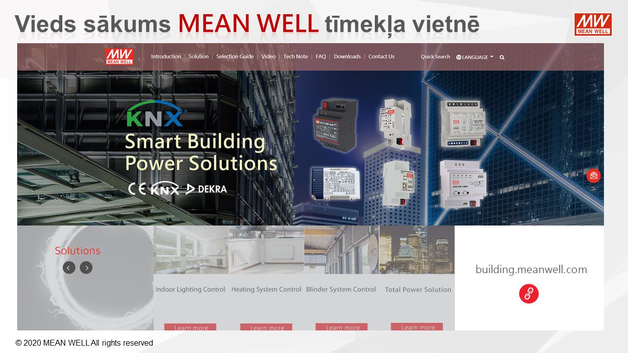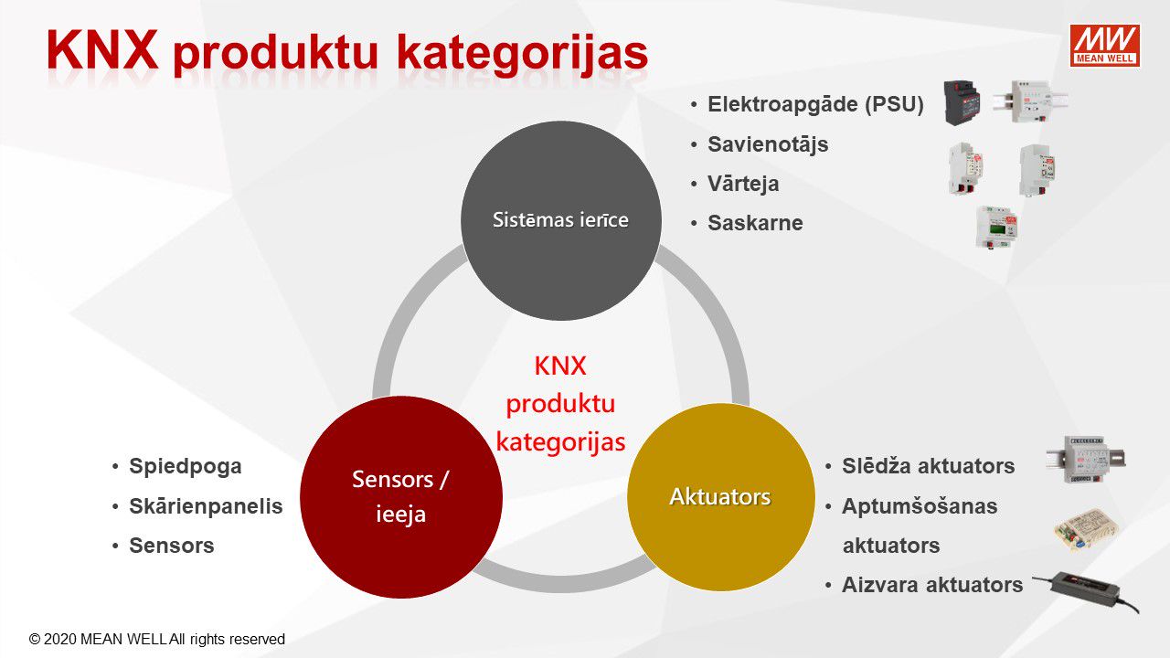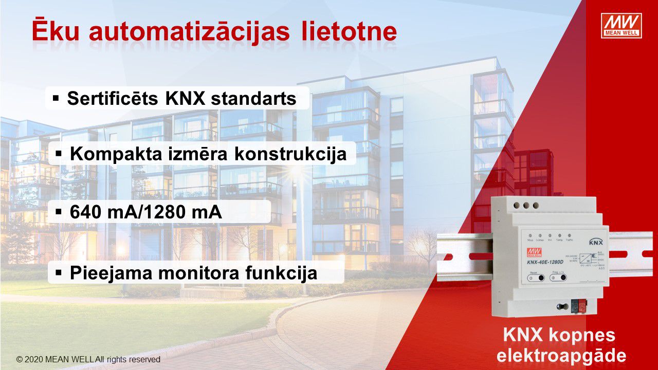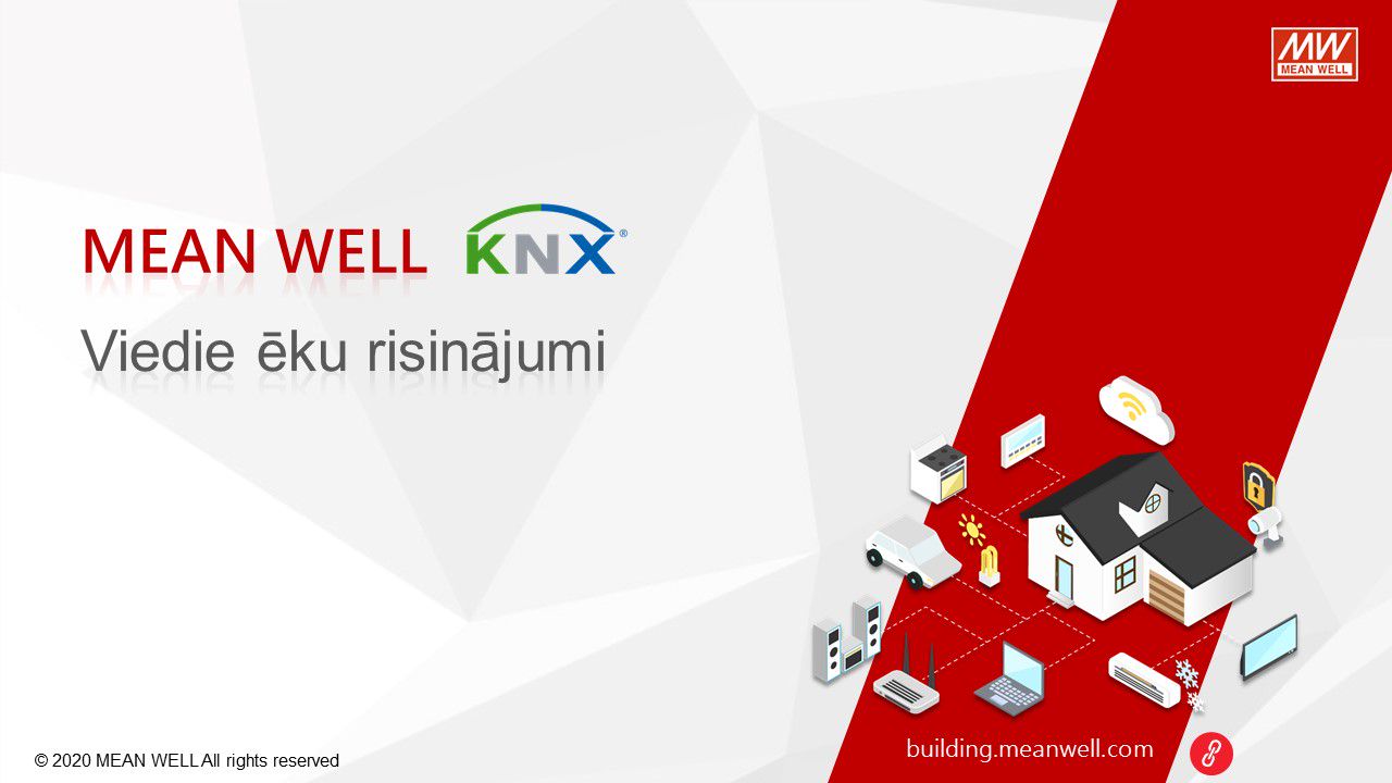 MEAN WELL, viens no pasaules vadošajiem barošanas avotu ražotājiem, piedāvā virkni KNX tīkla komponentu KNX tīkla barošanas avotiem, KNX / USB, KNX / IP, KNX / DALI saskarnēm, releja un 0-10V vadības moduļiem, impulsu barošanas bloki ar KNX CC un CV konfigutacijās. LED barošanas avoti no 25W līdz 120W. Pateicoties to funkcionalitātei un konfigurācijas iespējām, tieši tie atteikties no DALI risinājumiem privātmājās.