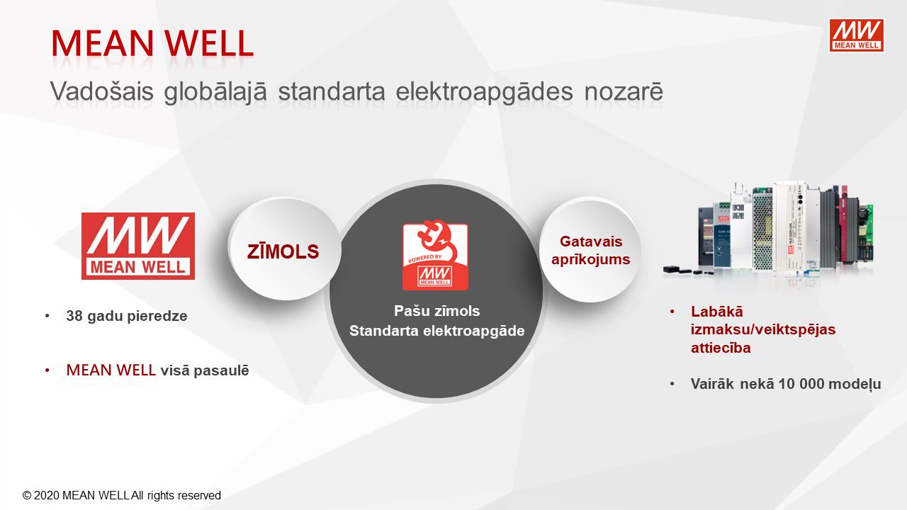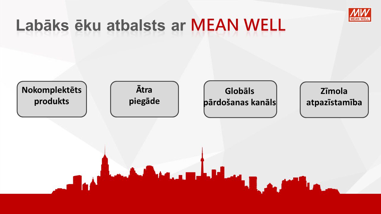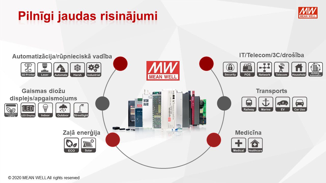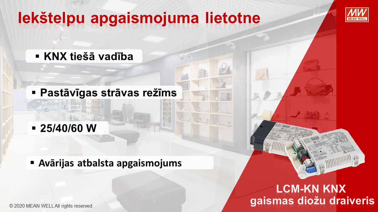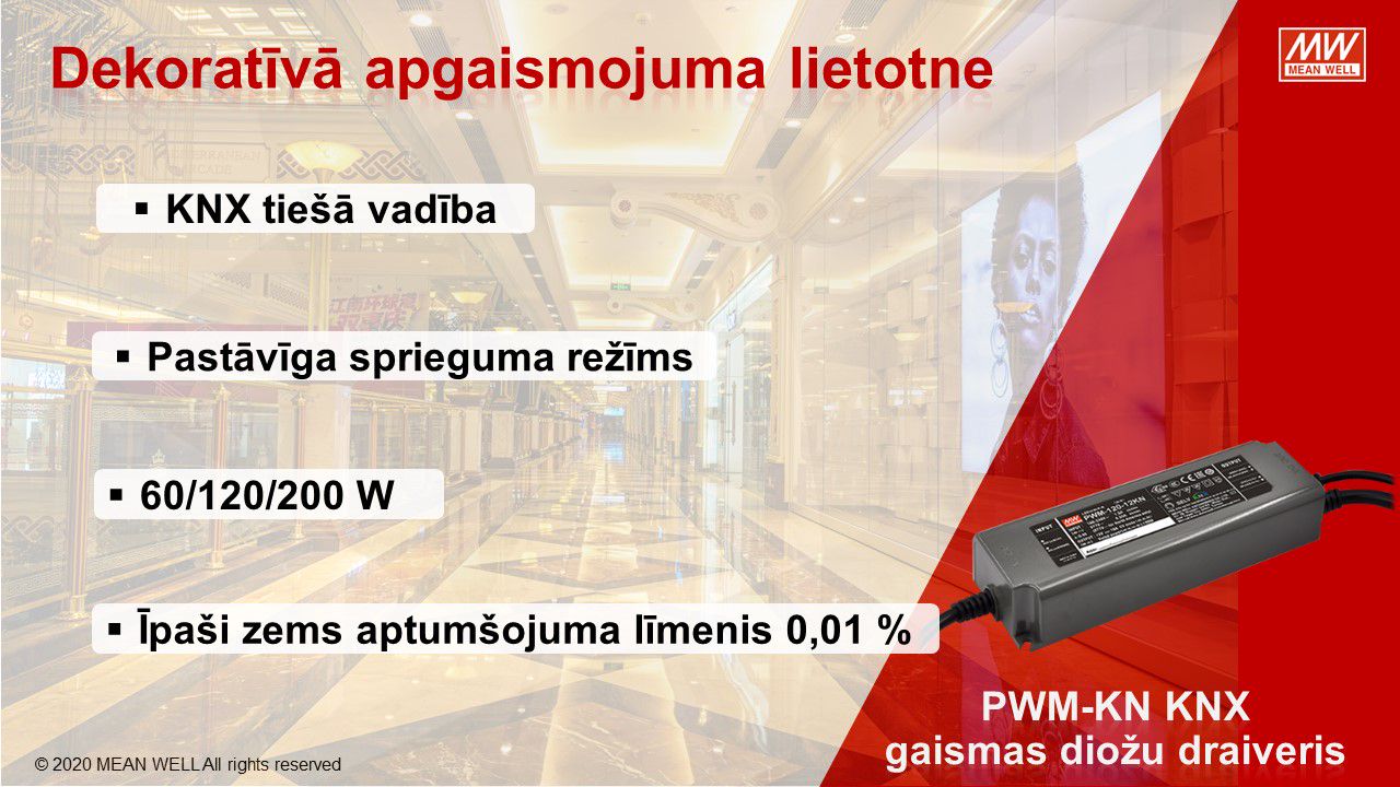 MEAN WELL, viens no pasaules vadošajiem barošanas avotu ražotājiem, piedāvā virkni KNX tīkla komponentu KNX tīkla barošanas avotiem, KNX / USB, KNX / IP, KNX / DALI saskarnēm, releja un 0-10V vadības moduļiem, impulsu barošanas bloki ar KNX CC un CV konfigutacijās. LED barošanas avoti no 25W līdz 120W. Pateicoties to funkcionalitātei un konfigurācijas iespējām, tieši tie atteikties no DALI risinājumiem privātmājās.